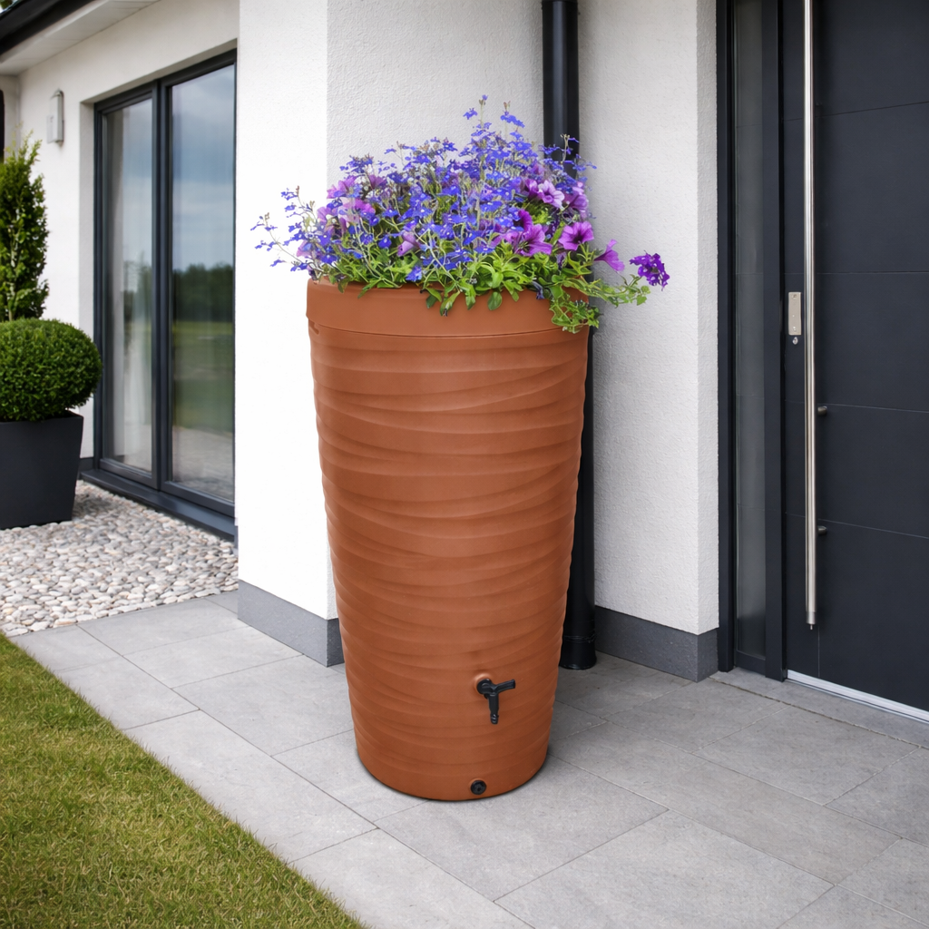 Mit ihrer schlanken, konischen Form, der stilvollen Wellenstruktur und der hochwertigen Verarbeitung ist diese Regentonne ideal für alle, die Wert auf Nachhaltigkeit legen, ohne auf Ästhetik zu verzichten. Ob im Vorgarten, auf der Terrasse oder direkt an der Hauswand – diese Regentonne überzeugt optisch und funktional gleichermaßen.